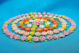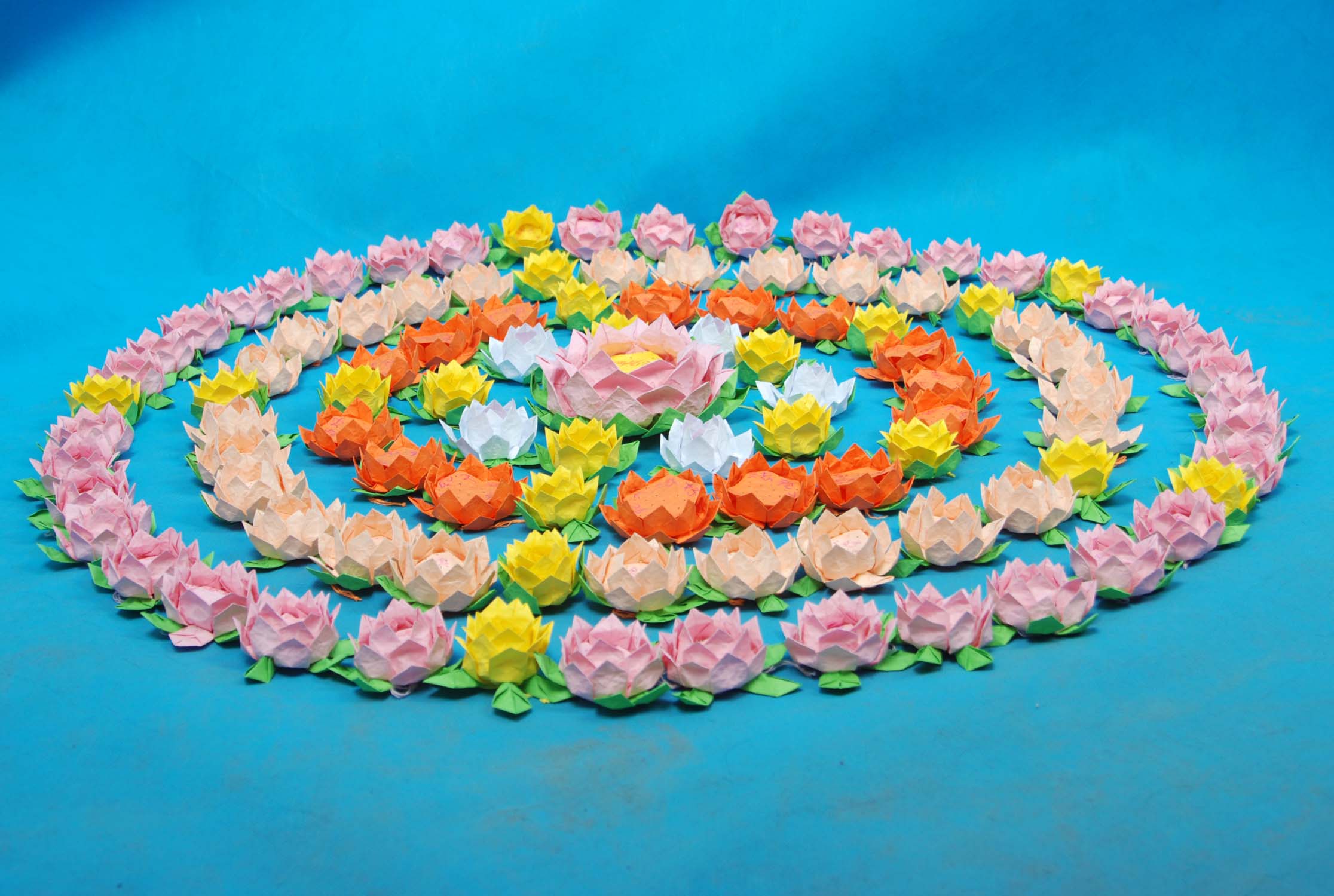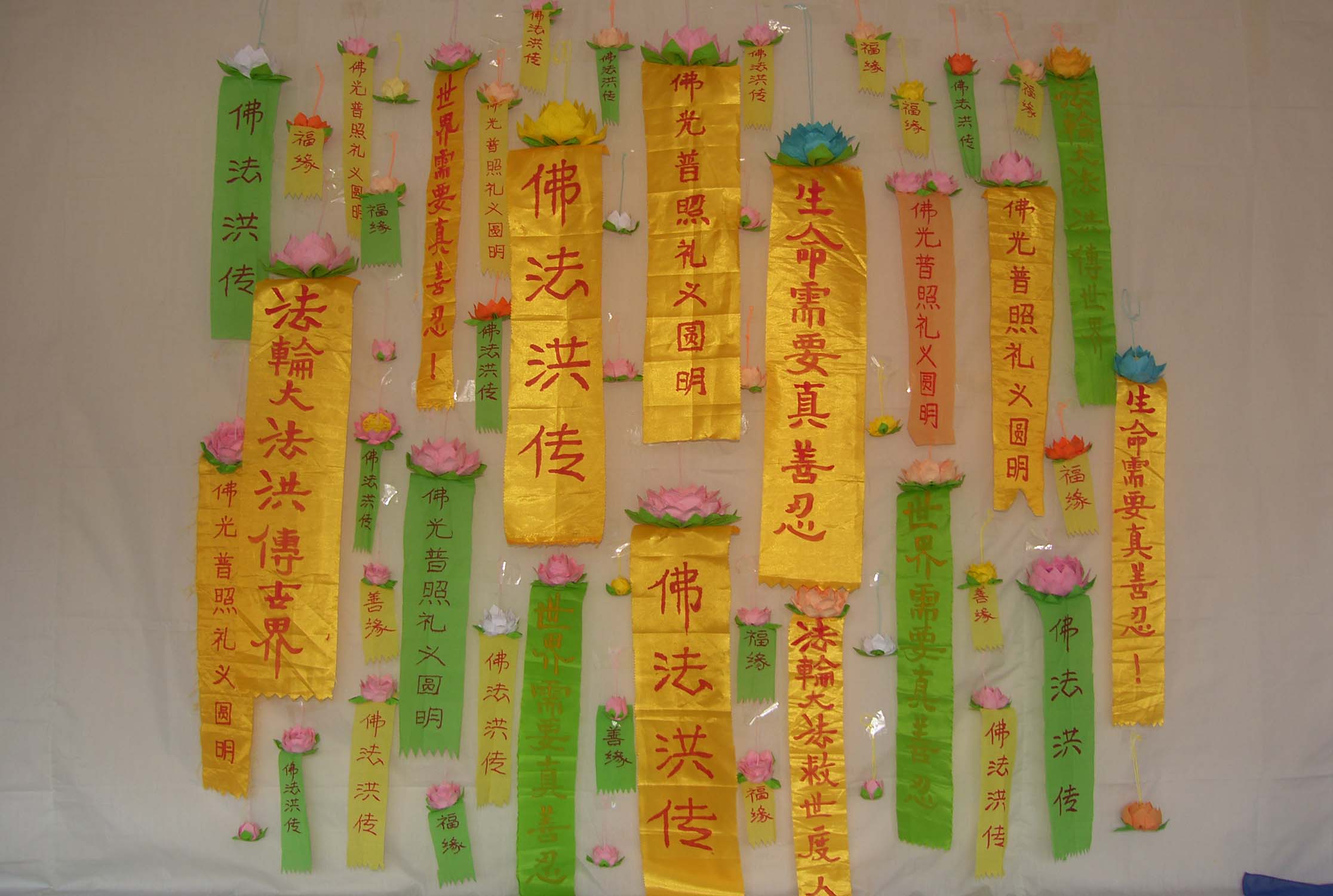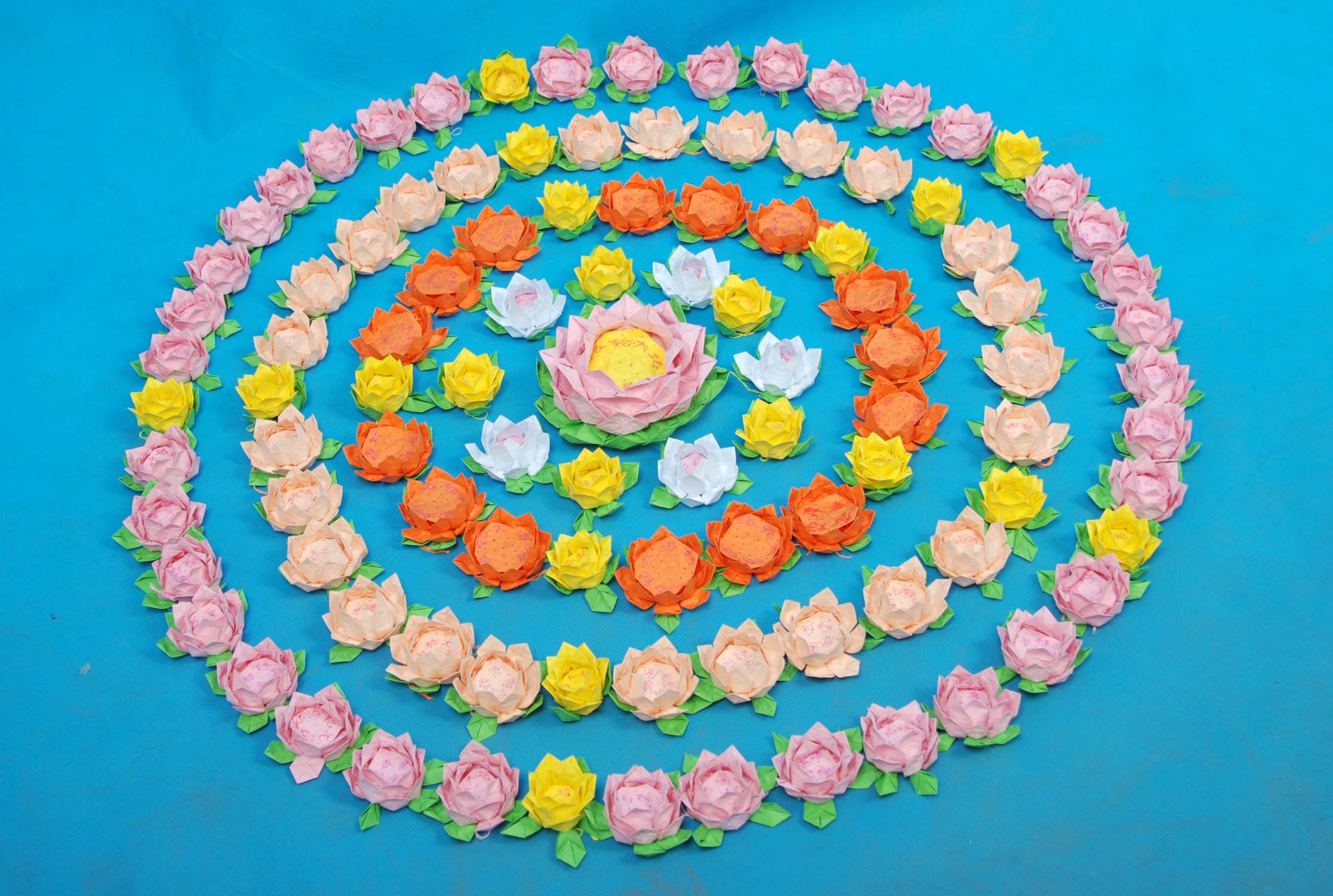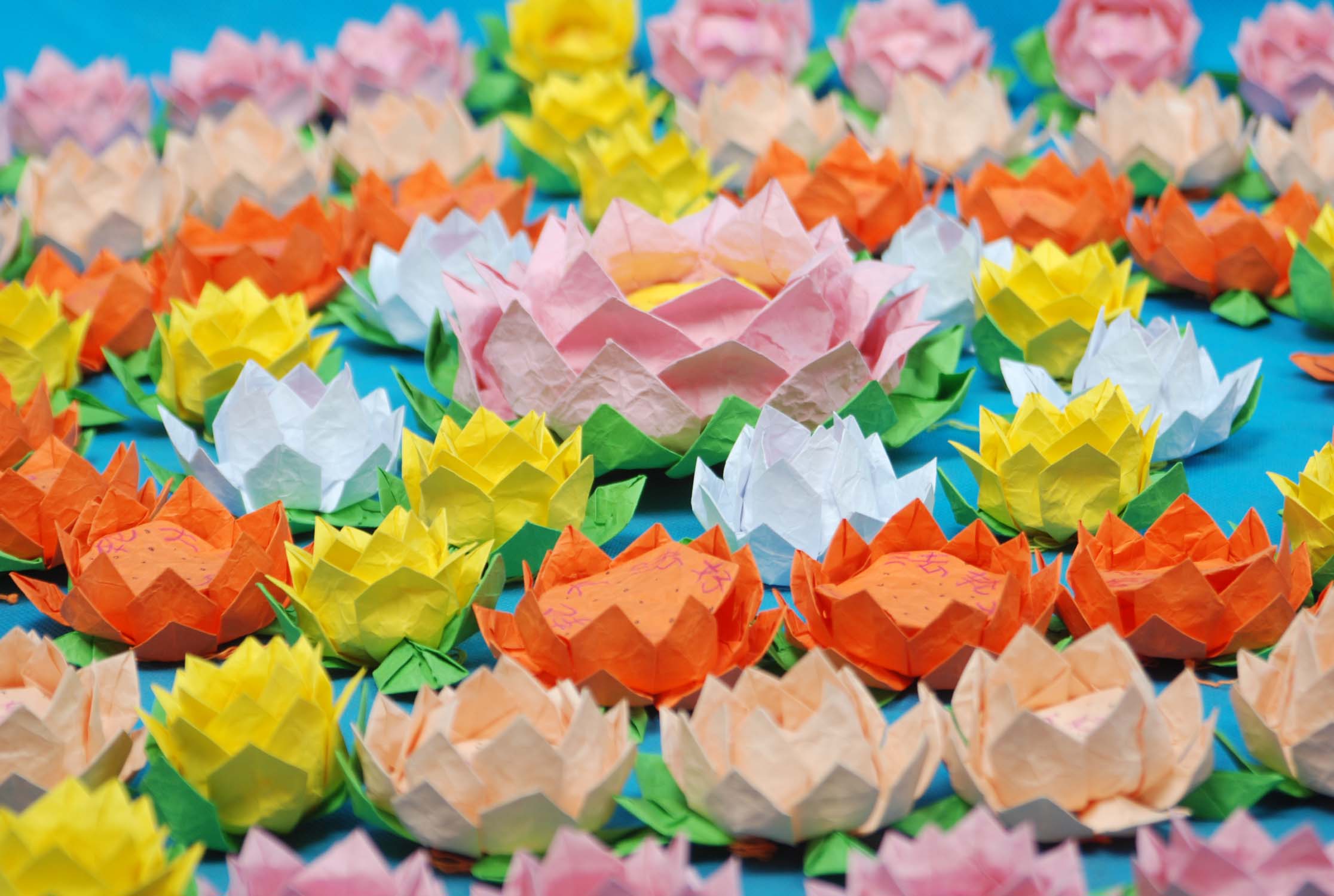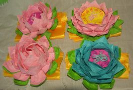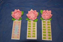 花的芯部是用纸片叠成圆形,然后用碳素笔点出莲子,再用艳丽一些的蜡笔写上“法轮大法好”,“真善忍好”,每个莲花上都写。花成型后,给人感觉精致、悦目,也突出了莲花的圣洁、脱俗、高雅、祥和,能让世人感受到大法的美好,逐渐体悟师父的慈悲,唤醒世人明白那一面为法而来的那曾有过的坚定信念。