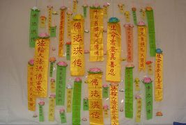 如果在高处悬挂证实法,一定在条幅上把大法的内容展现出来,如:“法轮大法弘传世界”、“法轮大法好,全世界都知道”等,避免和社会上的宗教混淆。当面赠送也很好,但底部不宜贴条幅。