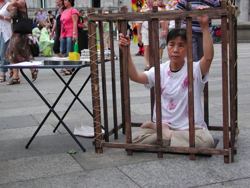 二零一零年七月四日星期六这天,德国科隆市区内有一个大聚会,据称科隆这天期待着近百万来参加活动和来看热闹的人们。一如每个周六,法轮功学员在科隆大教堂广场上举办了反迫害讲真相活动。为了更好地揭露中共对法轮功的残酷迫害,学员们还特别增加了真人模拟演示酷刑的项目。