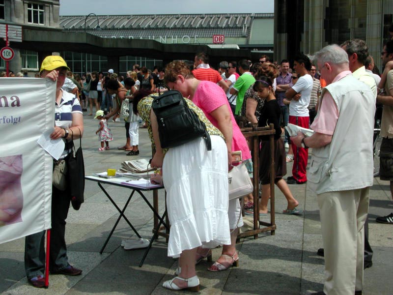 这个周六真是不同往常,来科隆的游人比平时的周六多出十倍以上,学员们在讲真相时接触到了更广泛的人群。一位德国学员说,她今天还接触到了作家、教师和政治活动家等。为了应对百万人潮,当地学员还特意设了两个签名桌,尽管如此,有些要签名表示支持法轮功的游人还是得在烈日下等几分钟才能轮上他。明白了真相的人们不仅仅签名,而且也想方设法要去广传法轮功真相。