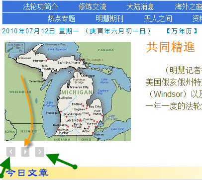 新版明慧网提供三篇头条文章,三篇头条文章会自动循回,读者可以根据自己的速度需要,点击头条图片下面两侧的灰色箭头,手工加快头条文章的浏览: