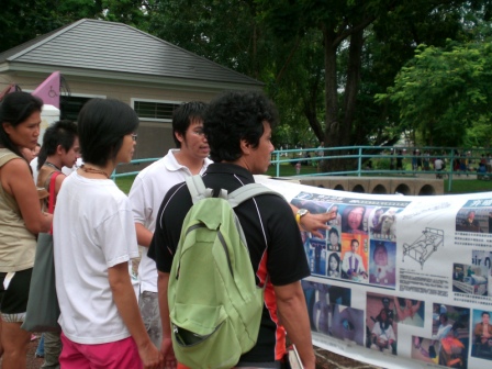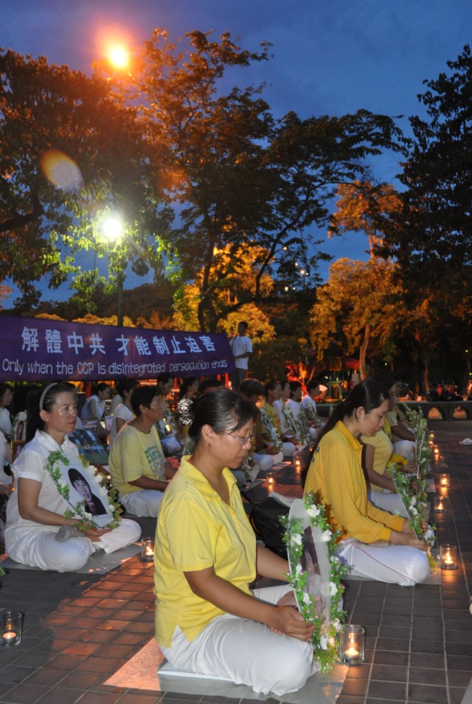 从一九九九年七月二十日至今,中共对法轮功的迫害已长达十一年,法轮功学员坚持和平理性地讲真相,赢得了越来越多的中国民众和国际社会的支持。七月十一日傍晚开始,泰国法轮功学员在曼谷最大的公园——是乐园的一个舞台和草坪上,拉开了“解体中共才能制止迫害”、“声援7600万中国民众退!党!潮”、“法轮大法好”等横幅,摆放了揭露中共残酷虐杀中国大陆法轮功修炼者、活摘法轮功学员器官、以及介绍大法在世界洪传等真相展板,并集体演示五套功法,举行反迫害和烛光悼念集会。庄严肃穆的场面,使许多游客驻足观看。