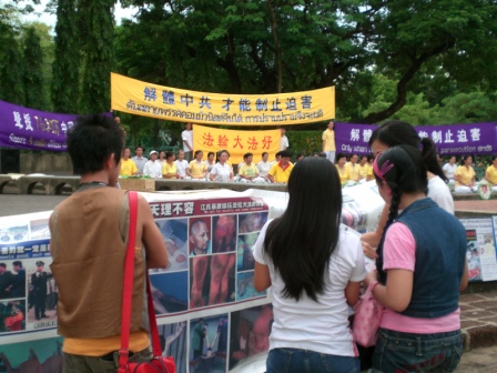 面对人们的难以置信和渴望了解真实情况,学员用泰语和英语详细讲述了法轮功是以“真、善、忍”为原则的传统修炼功法,因祛病健身和令人道德升华的神奇功效而在中国大陆广受欢迎,短短七年间吸引了上亿修炼者。然而,以谎言和暴力维持统治的中共不能容忍亿万民众对“真、善、忍”的信仰和追随,于一九九九年七月发动了对法轮功的“群体灭绝”迫害。十多年里,中共动用整个国家机器,对法轮功学员进行抓捕、劳教、酷刑折磨,据不完全统计,至今已经虐杀了三千多人。学员告诉人们说,舞台上几十位手捧遇害者遗照花圈的,都是曾在中国大陆惨遭迫害的中国法轮功学员。