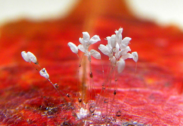 ![]() 飘落的枫叶上盛开圣洁的花,纤细的花瓣,花朵褶皱和花蕊清晰可辨(辽宁省,2009年) |