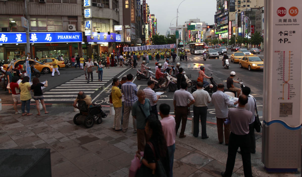 六合夜市是高雄市最著名的美食夜市,来高雄旅游的本岛和大陆人士都会慕名而来,街头到街尾人潮满满。在中山路口上,学员手持莲花灯夜悼,竖立巨大横幅“呼唤良知,结束迫害”和“悼念在中国被迫害致死的法轮功学员3397人”。在自立路上有四十位女学员胸前肃穆地秉持被迫害致死法轮功学员的遗照,播放真相影片,场面感人,在场的人很多都动容泪下。