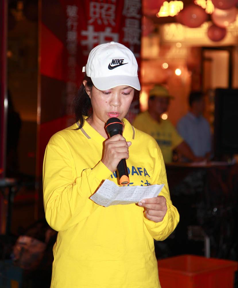 悼念会由法轮功学员组成的唐鼓队击鼓揭开序幕,主办单位表示:“法轮功是一个以‘真、善、忍’作为行为准则的善良团体,有上亿人在学炼,尤其在台湾由几万人增加至今几十万人学炼。许多人因为修炼法轮大法后身体恢复健康,家庭变得和乐,人人在单位上班认真负责,在社会上要求自己做好人中的好人,直接提升了社会道德。一九九九年七月二十日中共发动非法的、残酷的迫害,这完全出自于江泽民对于法轮功的妒忌心,他利用共产党全力发动了这场史无前例,毫无人性的镇压迫害。采用“名誉上搞臭,经济上截断,肉体上消灭”,扬言要在三个月消灭法轮功。如今十一年过去了,法轮功没有被消灭,反而洪传一百一十四个国家和地区,这就证明了法轮大法好。法轮大法普遍受到自由世界国家的欢迎和尊敬。今天在中国大陆,中共持续加重对法轮功的迫害,甚至活摘、盗卖法轮功学员的器官,今天遭受迫害致死的有名有姓的法轮功学员有3397位,成千上万家庭被迫害支离破碎,上百万学员被非法关押、劳教。全世界各地的法轮功学员无论天寒地冻,酷暑日晒,风吹雨打,全年无休地坚持不懈讲清真相。现在越来越多的人明白真相,认识到要制止这场迫害。唯有解体中共,才能停止迫害,人类才有美好的未来。”