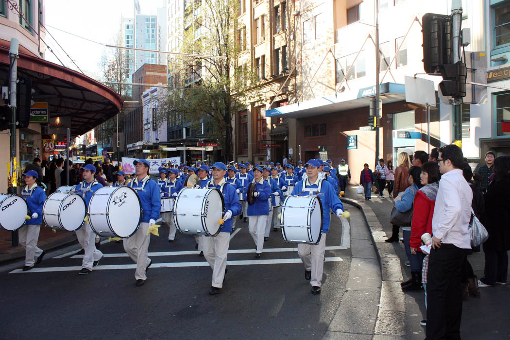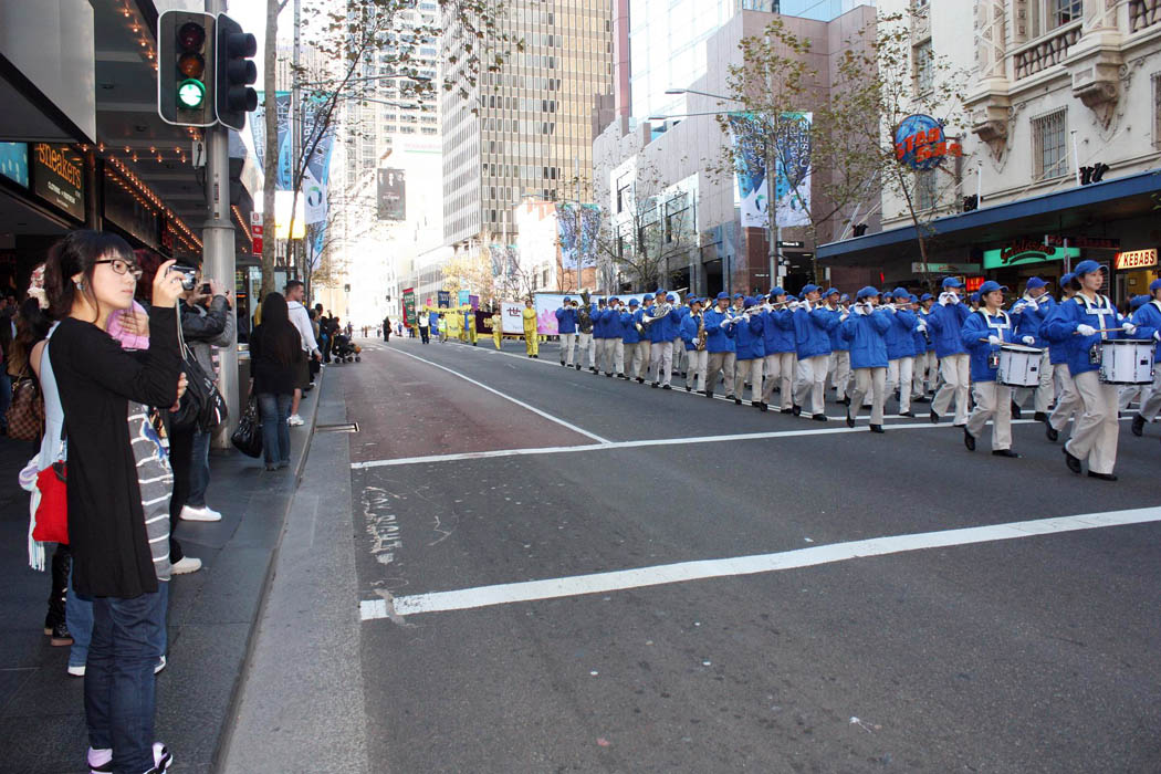 游行队伍于下午三时开始在悉尼市政厅前的乔治街出发,在声势浩大的天国乐团的引领下穿越著名的乔治主街朝中国城方向行进。雄壮威严的游行队伍伴随着天国乐团洪亮的演奏,引起众多路人的关注,他们纷纷驻足拿出照相机或手机拍下这震撼人心的一幕,许多行人还主动询问和索取资料,了解法轮功被迫害的真相。