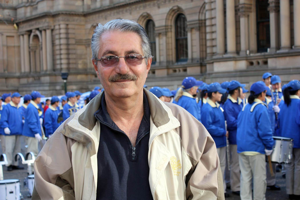 刚从中国大陆来悉尼的施先生也加入了游行的队伍,他并没有真正开始修炼法轮功,可是他早已做了“三:退.”(退出中共党、团、队),退出了已加入六十年的中共。因为家里的人修炼法轮功,他也得益知道了真相,并为身边许多人做了“三:退.”。他说:“因为我以前在单位里就是工龄较长,曾任党支部书记和宣传部长和文化部长等职位,也为党员上党课,所以当我一旦明白中共的不好处,我去和别人劝‘三:退.’就很容易,别人很信任我,我说得也很到位。我看了《·九·评*共产党》后,我帮助很多高层干部做了“三:退.”。”