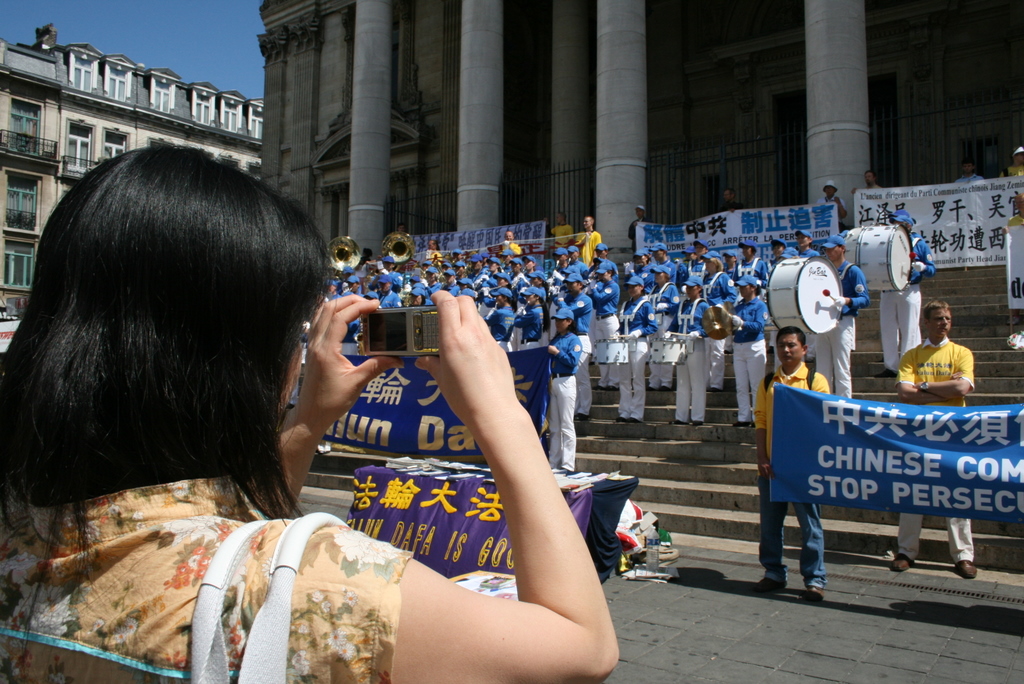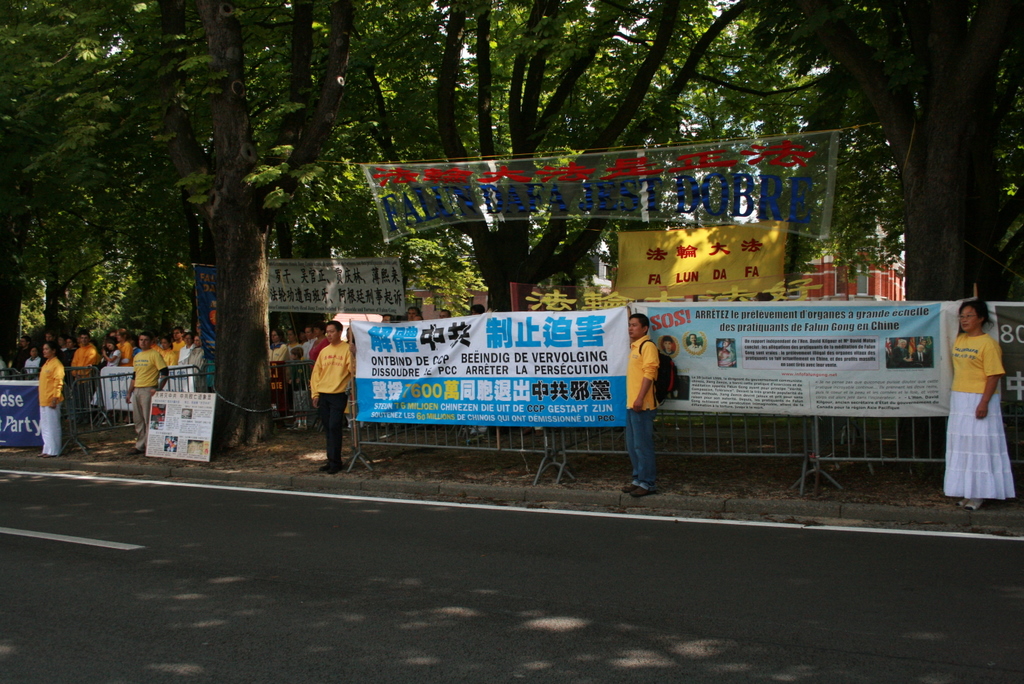 十七日上午,法轮功学员聚集在中共驻比大使馆前,他们打出“法轮大法好”、“世界需要真善忍”、“中共必须停止迫害法轮功”、“解体中共才能停止迫害”等大幅横幅,并播放中国人民和世界各国人民反对迫害的广播录音。