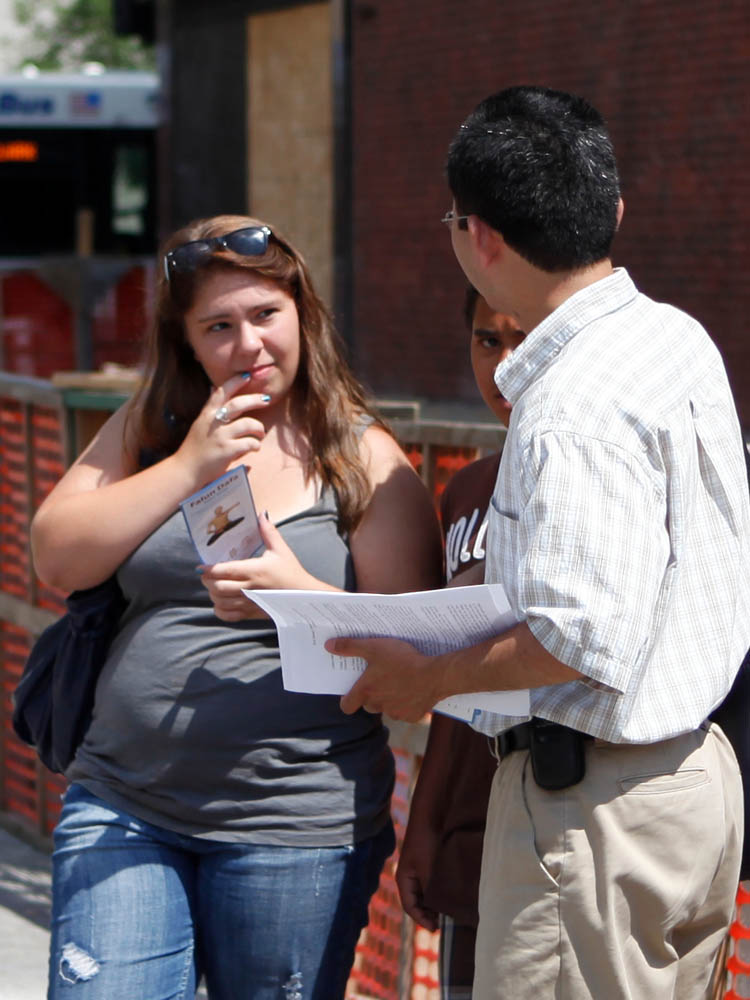 一位西班牙裔的男士也摇下车窗索取传单,学员刚刚向他介绍了一句“法轮功在被中共迫害”,他就接着说:“我知道,共产党杀了很多人!我知道!”
