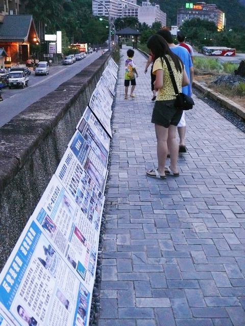 知本温泉是中国大陆观光客来台东必游之地。黄昏时分,河堤边挂满了“法轮大法好”、“美国众议院六零五号决议,中共立即停止迫害法轮功”与“西班牙以群体灭绝罪及酷刑罪起诉江泽民、罗干、薄熙来、贾庆林、吴官正”等醒目的真相横幅看板。