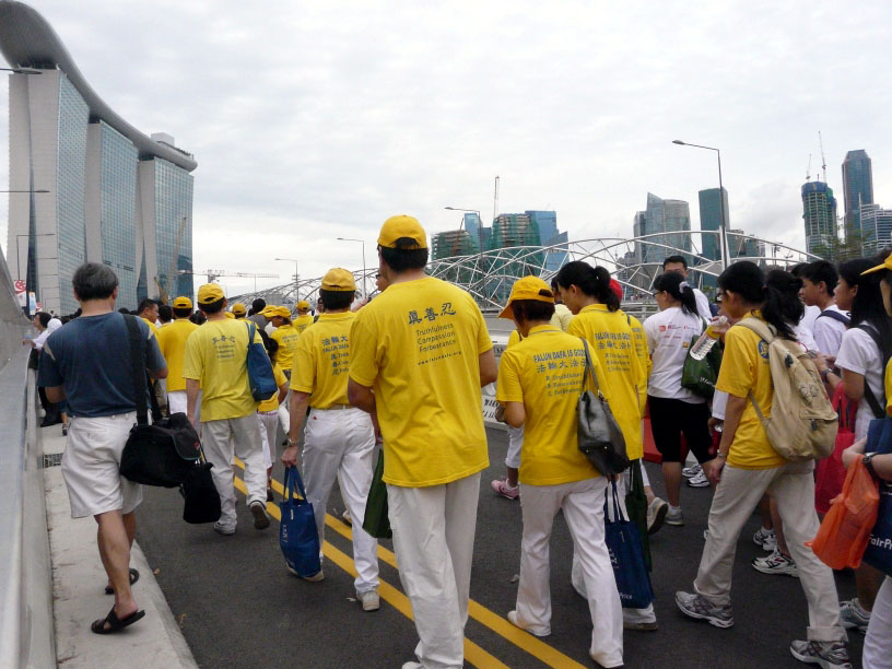 法轮功队伍也吸引来一名新报记者的采访。记者问了两个学员来自哪里?学员回答说,他们都是土生土长的新加坡人。记者又问他们是什么团体,其中一学员回答说,我们穿的T恤上的字“法轮大法好”,说明我们是法轮功团体。记者又问,你们经常参与这样的活动吗?学员说:新报几年来举办的大竞走活动我们都有参加,今年约三十多人参与。