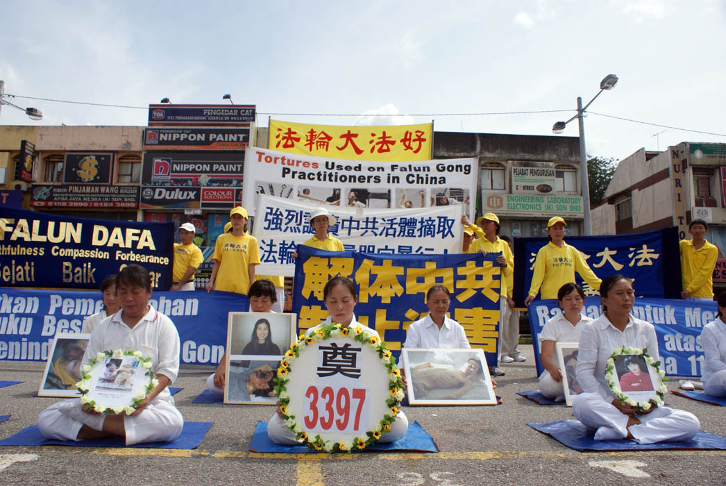 当天虽然烈日当空,法轮功学员依然顶着高温和平地守在现场,集体炼功,场面祥和,市民纷纷停下车辆了解真相。当地的马来民众当得知中共活摘法轮功学员器官后很震惊。