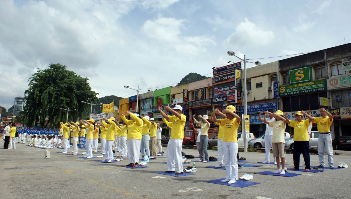 ![]() 马来西亚雪隆法轮功学员顶着烈日集体炼功,场面祥和。 |