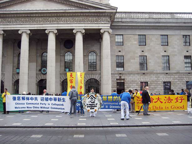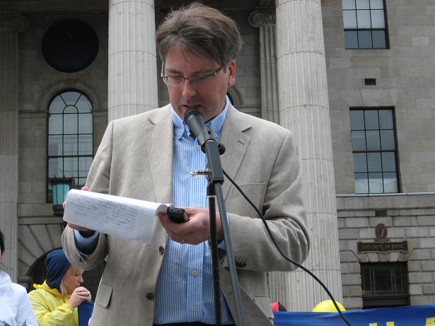 在演讲中她说:“今天我来到这里,是为了纪念被中共迫害致死的法轮功学员。这场迫害已经持续十一年之久,有三千多人被迫害致死,仅仅是因为坚持自己的信仰,仅此而已,这非常令人担忧,也是无法接受的。面对大量的审问中共必须回答。与此同时,国际社会还在给中共投入巨额资金,在经济利益面前,爱尔兰政府、欧盟和各国政府对迫害保持沉默。在中共的统治下,中国人民没有基本的人权。我们不反对中国人民,而是反对中共这个残暴的政权,和各国的缄默。”