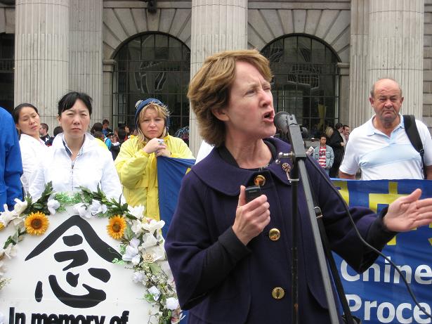 前欧洲议会议员、人权活动家帕翠莎•莫肯纳(Patricia McKenna)女士到场发表演讲。她长期以来非常关心法轮功学员的遭遇,并多次在不同场合呼吁欧盟和国际社会制止中共对法轮功学员的血腥迫害。