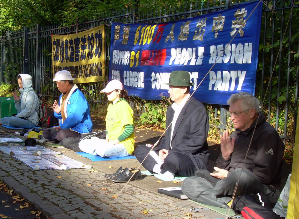 现场悬挂一条长十余米宽三米多“解体中共才能制止迫害”的横幅。据统计,中共执政以来,有八千多万中国人非正常死亡,只要中共存在,对法轮功的迫害还会继续,这是由其邪恶本质决定的。因此只有解体中共,才能制止迫害。