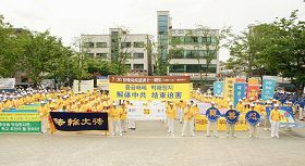 ![]() 学员向市民展示法轮功功法 |