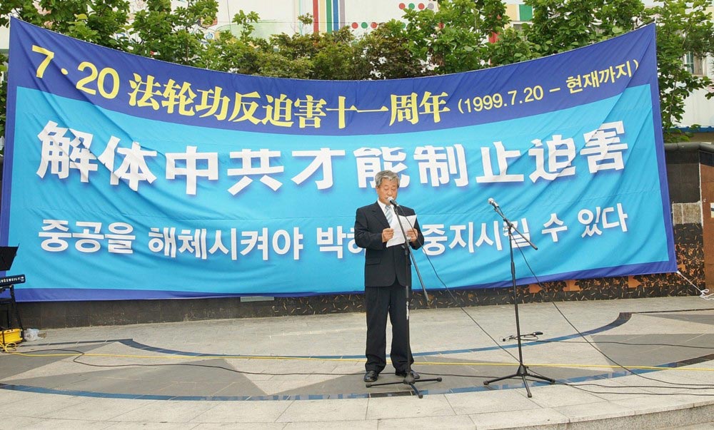 韩国法学博士、法轮功学员吴世烈说:“一九九九年七月二十日,江泽民发动全面迫害法轮功,今年是第十一年了,其间在中国一直进行着超出人们想象地对法轮功的残酷迫害,我们强烈呼吁制止中共迫害,严惩迫害元凶江泽民、罗干等。”