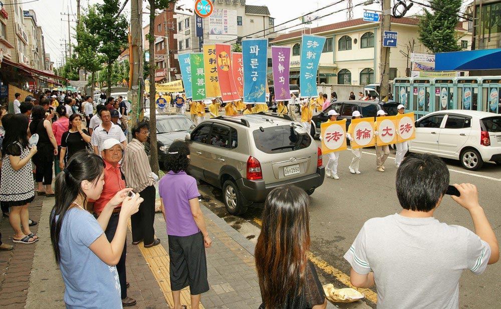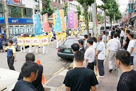 ![]() 法轮功游行队伍经过华人聚集地安山市,华人纷纷走出来观看游行 |