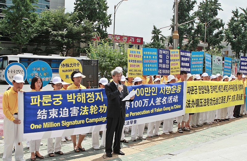 ![]() 二零一零年七月二十日,韩国首尔法轮功学员代表与市民团体在中共驻韩大使馆前举行集会,声援“结束迫害法轮功全世界百万人签名活动” |