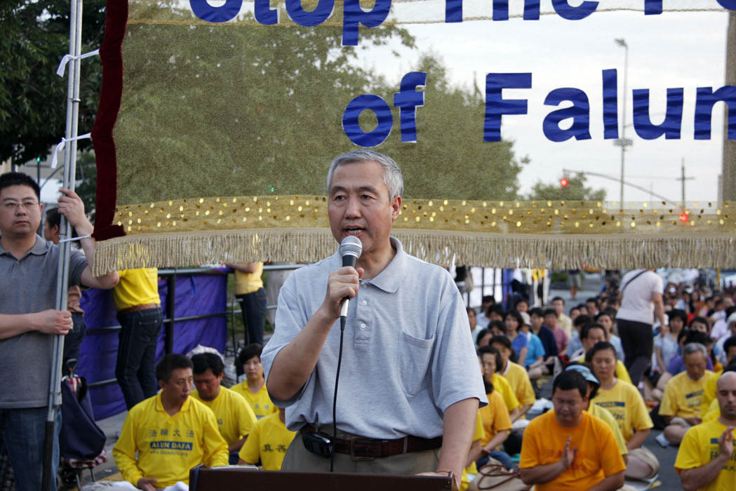 集会主持人表示:十一年后的今天,我们要求立即停止迫害法轮功,立即释放所有被关押的法轮功学员,立即解散“六一零”,将江、罗、刘、周等迫害元凶绳之以法。