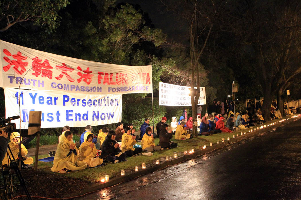 暗夜寒雨下,点点烛光摇曳不灭。中领馆前,墨尔本法轮功学员们自始至终在草坪上静坐,坚毅而平和的身影在风雨中没有丝毫动摇。没多久,风雨渐歇,他们依旧面带祥和静静打坐。面对中领馆,他们打出的中英文横幅有「法轮大法」、「十一年迫害必须结束」和「法办江泽民、法办罗干、法办周永康、法办刘京」。整个场面凝重坚忍而又平和感人。