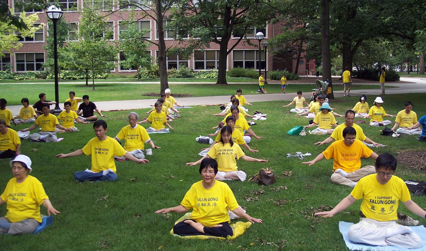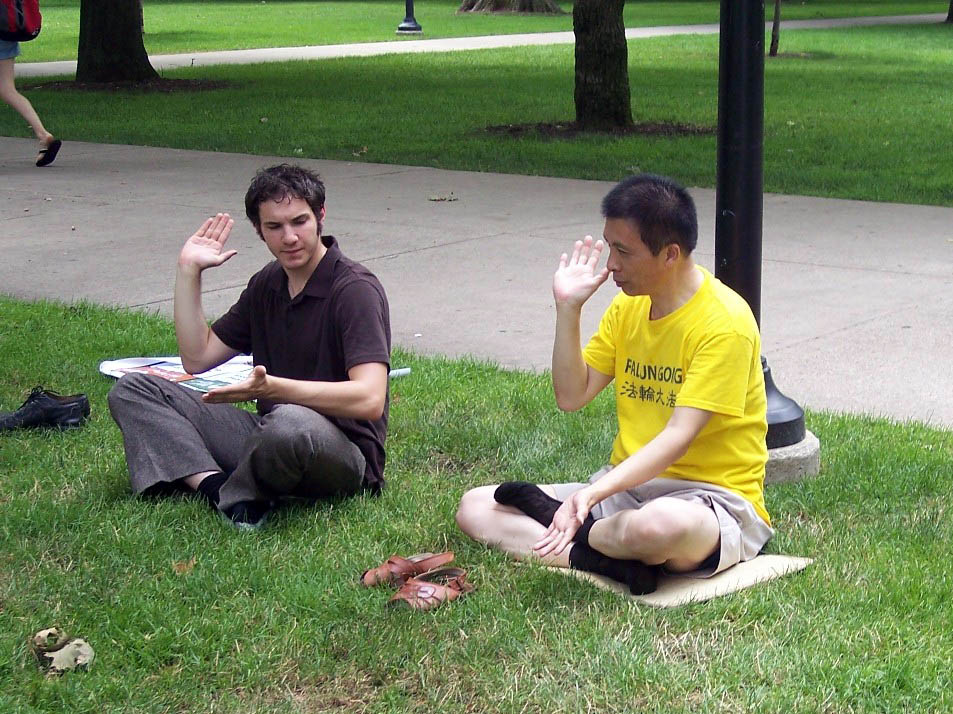 二零一零年七月十八日,学员们再次聚集在安娜堡校园中心的草坪上,宁静安详地炼习五套功法,一面面真相横幅、展板让很多师生驻足观看,了解了什么是法轮功,为什么正在遭受无端的迫害,等等。发放传单的学员们和行人交谈,也有人停下来学炼功法。