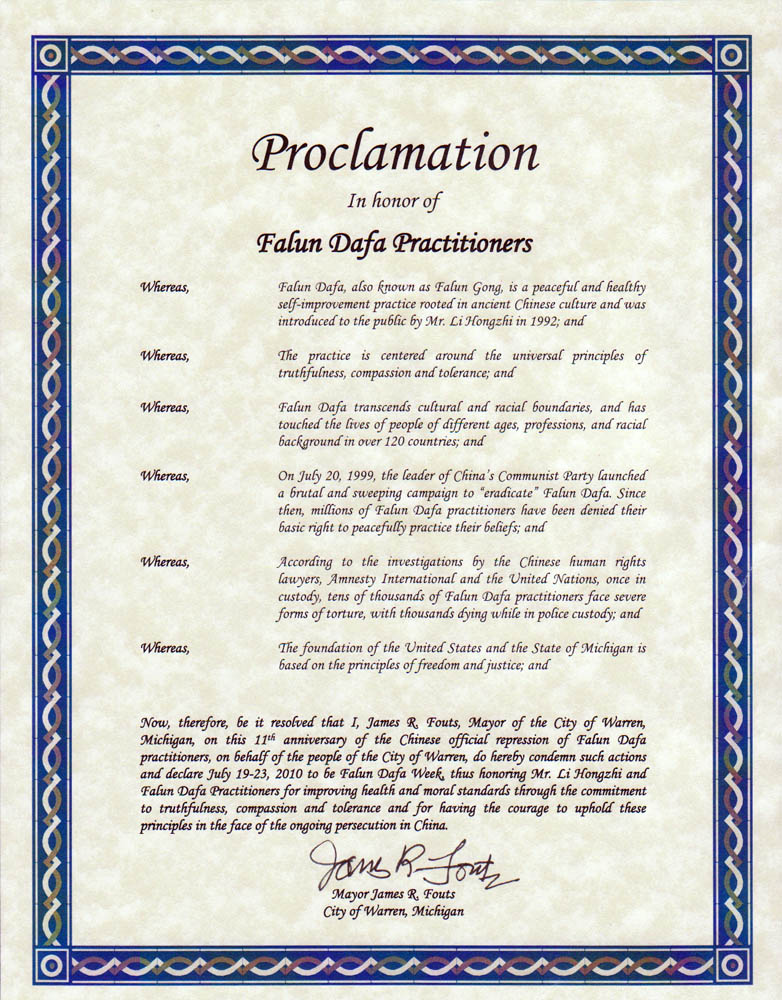 同时,沃尔任(Warren)市市长吉姆•福斯(James Fouts)特别在当天颁发褒奖,褒奖令特别提到了成千上万的法轮功修炼者正在遭受酷刑,并强烈谴责迫害;同时赞扬法轮大法穿越了种族和文化界线,让不同年龄,不同种族,不同职业的人们都受益。
