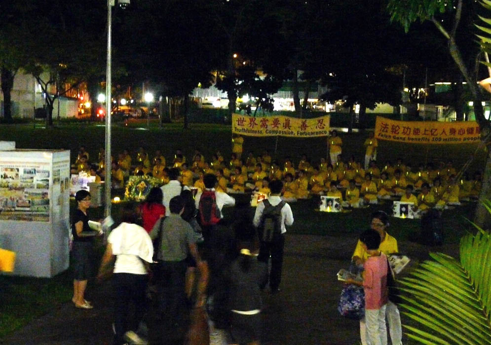 法轮佛学会代表在集会上发表声明,回顾了十一年来法轮功学员承受巨大苦难、坚持正义维护信仰的历程,并促请新加坡各界了解真相,站在正义一边。