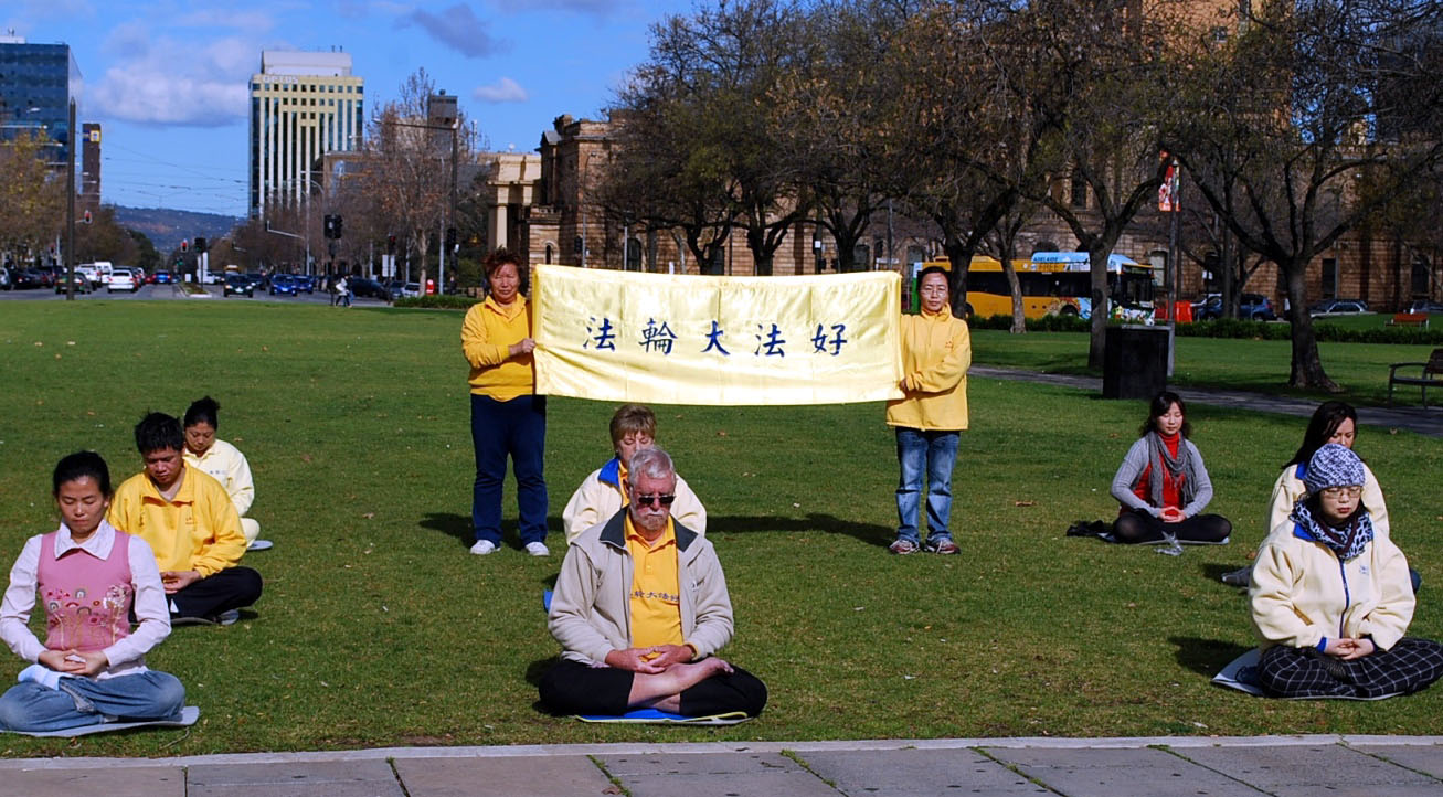 一周来阿德雷德的天气阴雨不断,周六早晨,终迎来了难得的好天气。维多利亚广场飘荡着祥和的炼功音乐,法轮功学员随着优美的音乐进行了两个小时的集体炼功,宁静祥和的场面吸引着过路行人。地上摆放着的真相展板,系统地向社会各界揭露中共在历史上对正义良知的虐杀。学员们热心地把资料发给路人,并给他们讲真相。