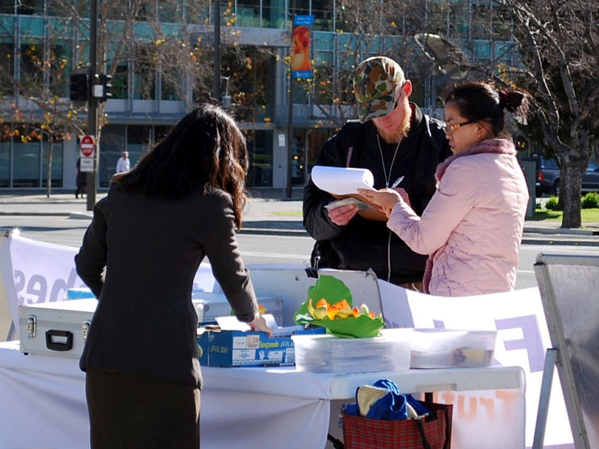 一家看起来是欧裔的人路过,很感兴趣地停下来看展板,听完学员讲真相,还解释给他们的父母听,父子俩争着签名。
