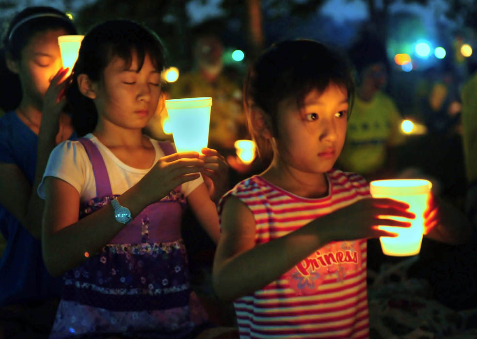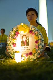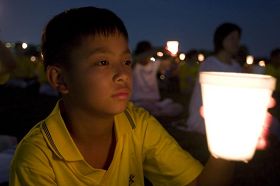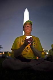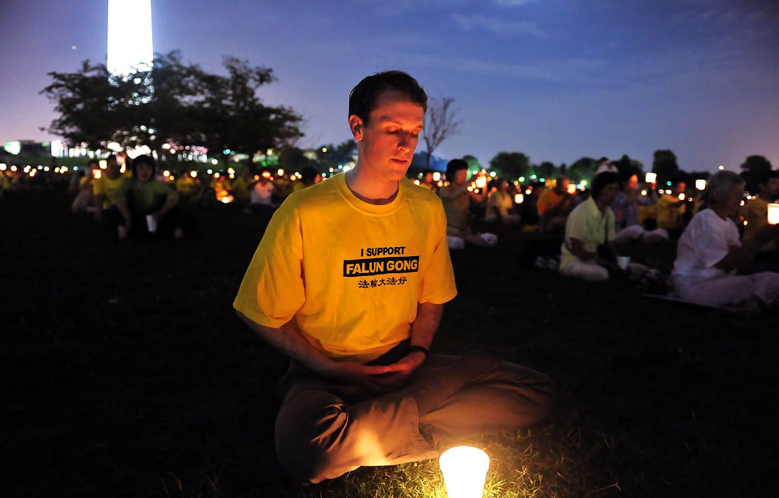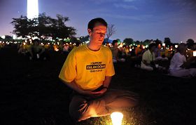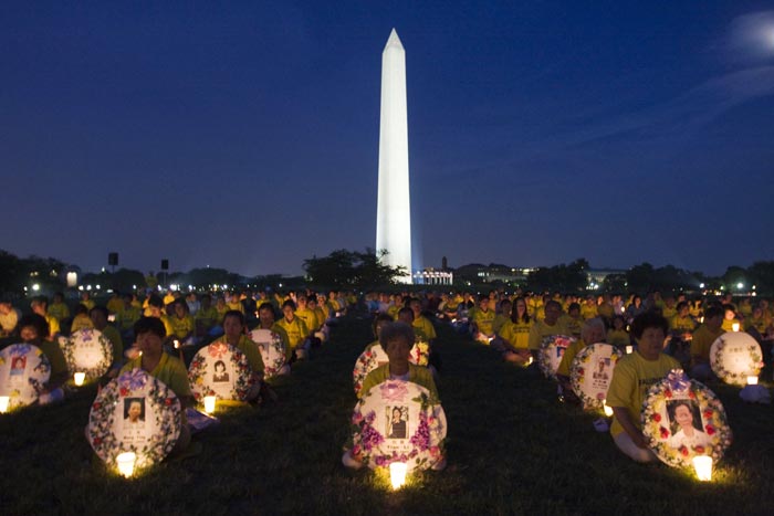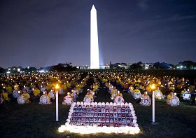 【明慧网二零一零年七月二十三日】(明慧记者苏青华盛顿DC报道)“今天,在这喧嚣伴着落日散尽,天与地都融归于苍穹的时刻,来自世界各地的大法弟子与正义人士再次来到美国首都华盛顿,聚集在这象征着自由与希望的华盛顿纪念碑下,悼念那些为坚守自己的信仰与良心、维护真善忍宇宙真理被中共致死的法轮大法弟子。……”随着主持人庄重地宣读烛光夜悼开幕词,二零一零年七月二十二日晚,在美国首都华盛顿纪念碑前,法轮功学员以烛光排出“Falun Dafa”以及逾千人的烛光方阵,悼念被中共迫害致死的中国大陆同修,揭露并呼吁制止迫害。场面庄严、肃穆,不少游人停下脚步,询问详情。