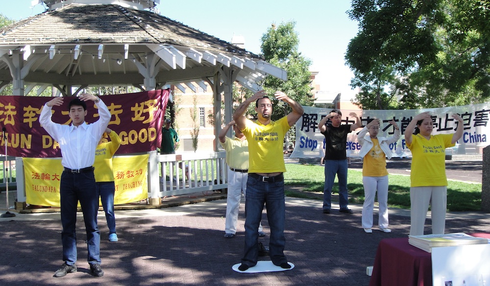 一位女士带着孩子经过。当她看到法轮功学员的炼功场面时,情不自禁的说,“太平和了!”简直不敢相信如此宁静祥和的功法会被中共如此残酷的迫害。很多行人在了解了真相后,询问炼功点的情况,想要学习法轮功。