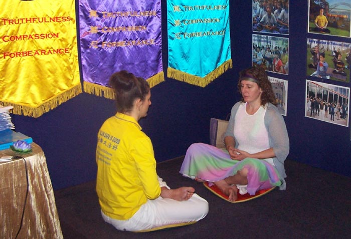 ![]() 民众在布里斯本身心灵庆典展览会上学炼法轮功 |