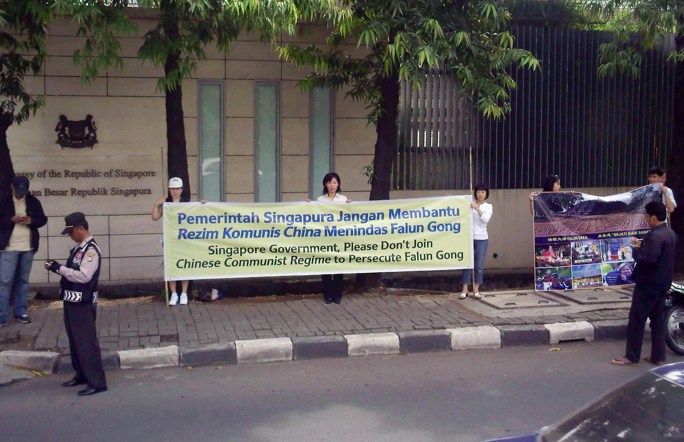 二十九日上午,雅加达时间十点三十分,印尼法轮功学员来到新加坡驻印尼使馆前和平抗议。横幅上用中、英、印三种语言写着:“新加坡莫帮中共迫害法轮功”。印尼法轮大法学会的会长盖托特•马查理(GATOT MACHALI)与发言人叶雄增(YAP SUNGKONO)把请愿信递交给新加坡驻印尼使馆工作人员。在保安人员询问过使馆里面的工作人员后,对递交信件的两人说,使馆的工作人员不会出来接受请愿信。盖托特•马查理把信件放在了使馆门卫处的窗前,希望新加坡使馆的工作人员可以接收信件,并转达给新加坡政府。