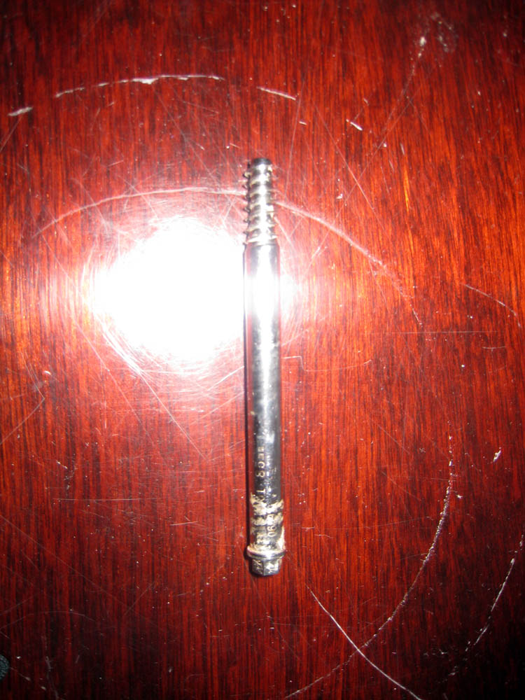 二零零九年五月四日,这位老同修在炼第四套功法“随机下走”时,感觉有什么东西挡胳膊,睁眼一看,在原来刀口的地方露出来一个东西,她停下来捏着露出的头把它连拔带捻拽出来了,不痛也没出血,一看是一个钢螺栓,一端是螺丝杆,一端是六方螺栓帽,直径约8毫米,长约9公分。这根钢棍一端只带点血丝没出血,顶破肉皮的创口把肉皮摁上,没经任何药物处理慢慢的愈合了。