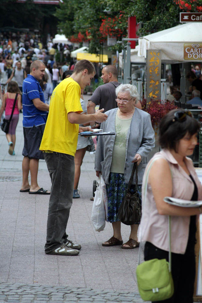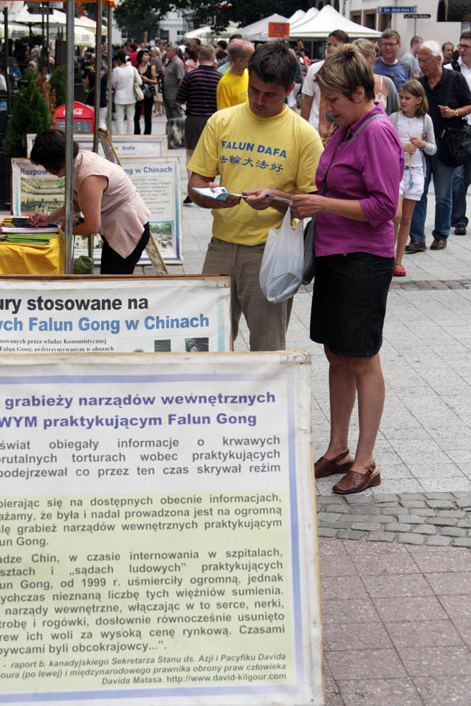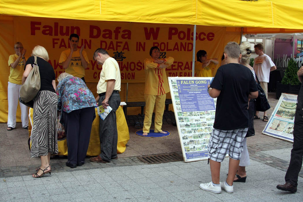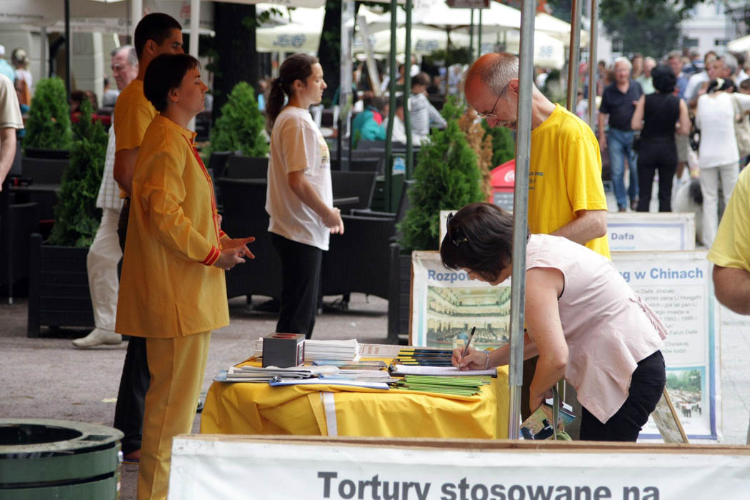 星期六早上,法轮功学员来到索波特,在著名的蒙特卡西诺海滨长廊前,挂上“法轮大法好”的横幅,支起黄色的帐篷和反迫害征签台,向众多游人发放法轮功真相传单,并在平缓祥和的音乐中展示法轮功五套功法。长长的真相展板前很快就挤满了人群,五套功法更是吸引了很多游客驻足观看。大家纷纷索取真相资料,认真倾听法轮功学员讲述当今中国正在发生的已持续十一年的共产党对法轮功的残酷迫害。众多游客,其中相当多的游客是外国人,都在反对迫害的请愿书上签名,表达他们对中共暴行的抗议。