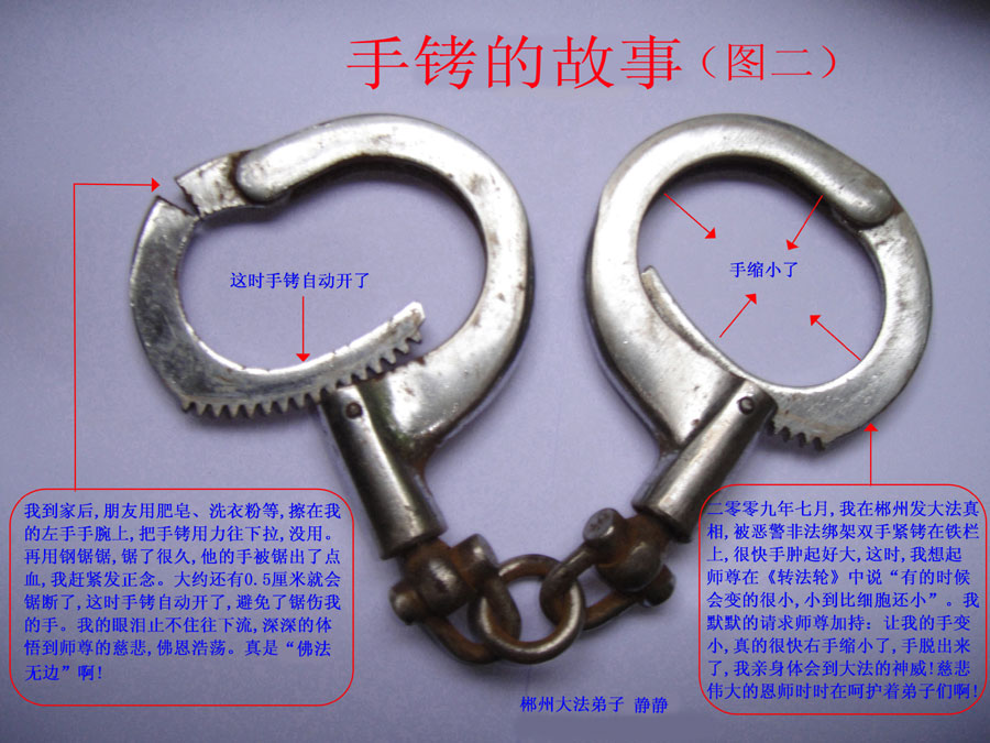 我到家后,家人用肥皂、洗衣粉等擦在我的左手手腕上,把手铐用力往下拉,没用;再用钢锯锯。锯了很久,他的手被锯出了点血,我赶紧发正念。大约还有0.5厘米就会锯断了,这时手铐自动开了,避免了锯伤我的手。