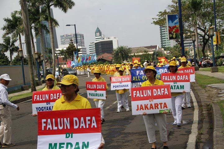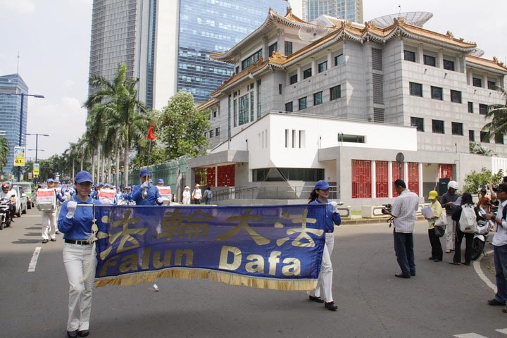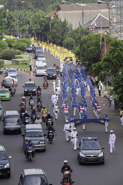 下午一点钟,游行从中共驻印尼使馆前出发,游行的终点在大印尼酒店前的喷水池。走在最前头的天国乐团,演奏的乐曲震撼人心,整个场面非常壮观。天国乐团的后面,紧接着法轮功学员组成的旗队、舞蹈队、腰鼓队、炼功团队,排成的队伍约一公里长。