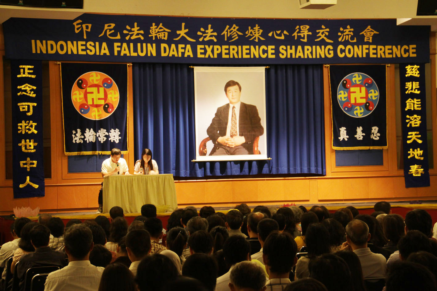 上午九点,法会正式开始。共有十二位学员讲述了自己在法轮大法修炼中的心得体会。老学员平安谈了自己历经二十多年的寻寻觅觅,终于得到大法,得法后精進实修,开辟新炼功点和做好辅导员工作;得法才三个月的新学员阿玲,谈了她得法前后的神奇经历;在游轮上工作的巴厘岛学员谈了自己如何在游轮上对不同国家的游客讲真相、利用游轮周游各国的有利条件为大法弟子创办的媒体提供各种素材;二零零八年才得法、来自日惹的学员拉尼,在希望.之声巴丹岛地区电台遭到警察没收发射器材、许多员工纷纷离开、电台工作处于最困难的时刻,她毅然加入电台的播音和广告工作,发言中她讲了如何怀着正念向客户讲真相,使广告工作有了新的突破。