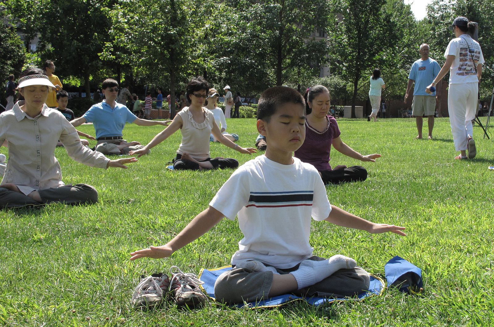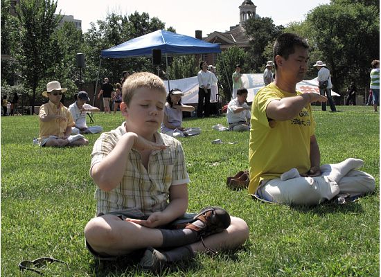 来自法国的九岁男孩亚历山大•道(Alexandra Tou)跟父母来费城观光旅游,父母进到自由钟中心看钟,亚历山大却象磁石般地被法轮功的音乐和打坐所吸引。他径直走到法轮功学员炼功的行列中,坐下来闭上眼睛打坐。他告诉笔者,他从小就对东方的打坐冥想感兴趣,从六岁开始就央求父母带他找一位“中国老师”学习打坐。今天来到费城自由钟,看到法轮功的炼功场面,他说这就是他从小要找的“中国老师”和打坐。在他的父母进去看自由钟的十几分钟里,亚历山大静静地坐在一位法轮功学员的身边,模仿着他的动作和姿势学习打坐,他说“感觉非常美妙”,一直沉浸在打坐的美好感觉中不愿意睁开眼睛,直到他的父母看完自由钟回来叫他离去。因为不太会讲英语,他很希望能看到法语的学习资料。