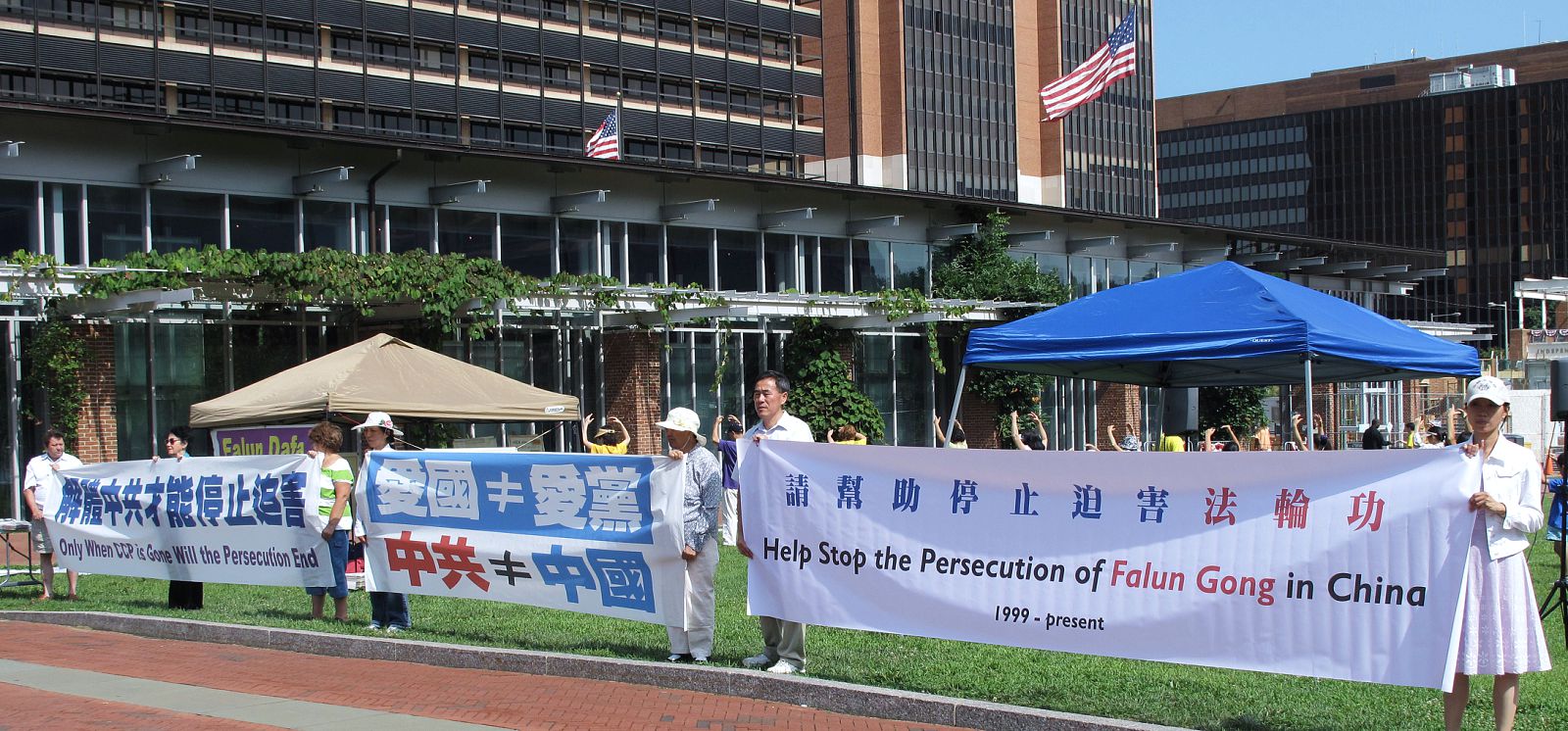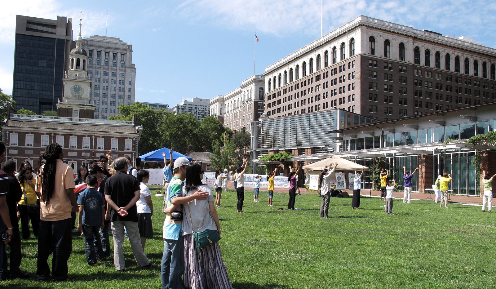![]() 法轮功学员在费城自由钟前草坪上集体炼功 |
