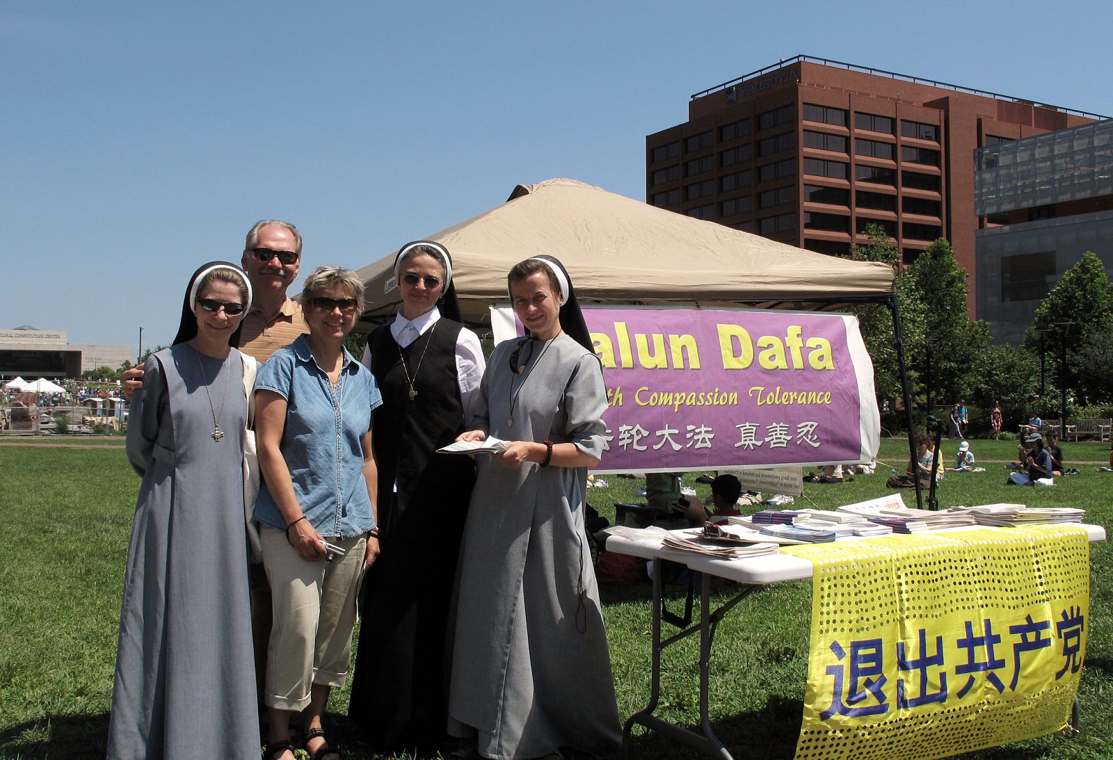 来自乌克兰的三位天主教修女阿德亚娜(Adriana)、鲁克雅(Lukia)、迪亚(Dia)和朋友路桑安纳(Lusana)、奥克斯纳(Oksnan)看到法轮功学员炼功场面和退!党!横幅,对笔者表示,“我们非常理解,非常支持他们。”