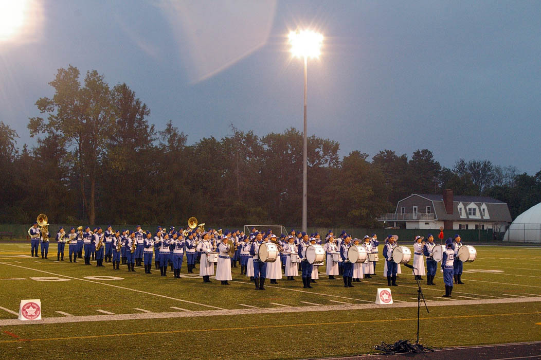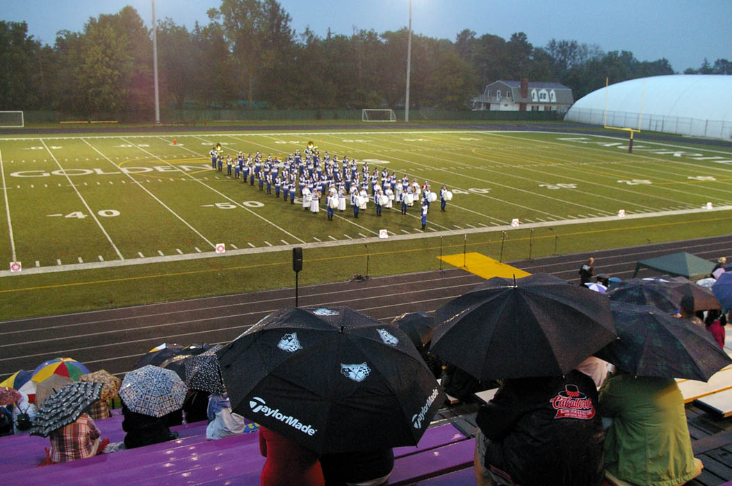 全场响起了热烈的掌声和欢呼声。一直站在雨中等待了二十多分钟的天国乐团奏起了雄壮的乐曲,走进了体育场。
