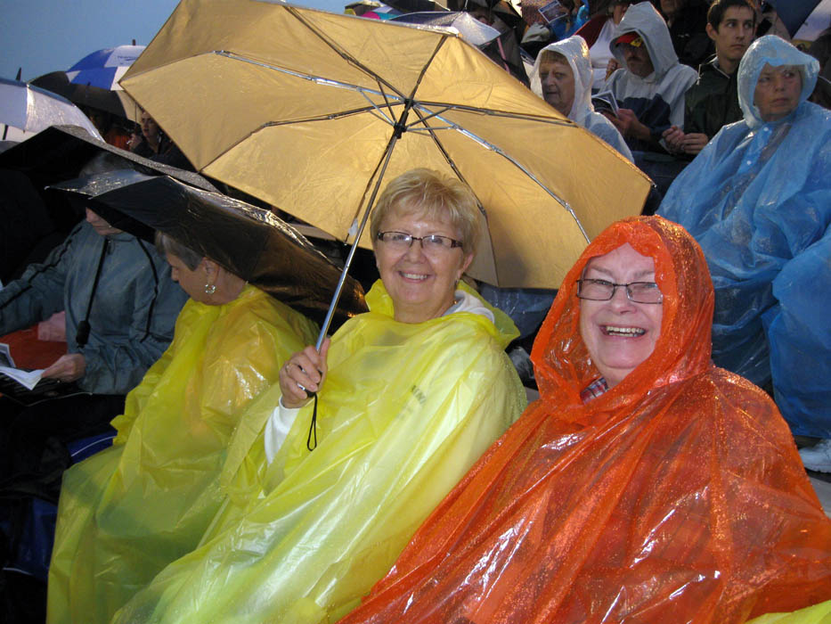 来自剑桥(Cambridge)的琳达(Linda)和帕(Par),与她们的朋友们兴高采烈地观看着表演,琳达说:“他们的演奏让我忘记了下雨,为了看清楚点,我把雨衣的帽子都脱了。我们享受着他们给我们带来的每一分钟。”