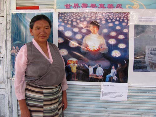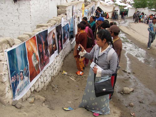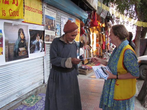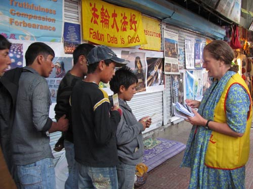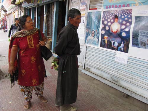 七月十八日,一些学员来到拉达客地区的最大城市列城(Leh)讲真相。每一个路人都很高兴收到传单和了解法轮功真相。藏人非常支持学员的活动。拉达客人,来自不同地区的印度人和不同国家的外国人也为收到真相资料感到幸福。