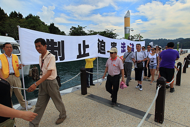 ![]() 广东旅游团八月十九日下午由日月潭玄光寺下船,随即入眼的是法轮功学员举的制止迫害法轮功的横幅,黄华华因惧怕最终未上岸。 |