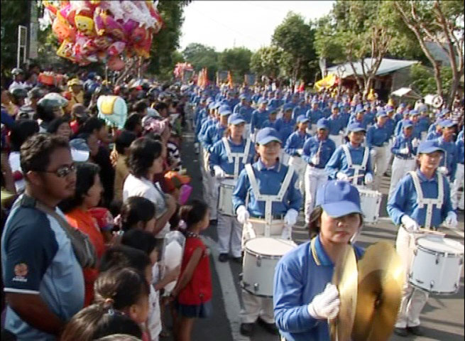 由二百多名来自台湾、新加坡、日本和印尼本国法轮功学员组成的“亚太天国乐团”经过之时,观众争相拍照并与乐团合影。沿途热爱音乐且热情好客的印尼民众随着天国乐团的行进鼓声舞动起来。路边一个手持印尼特有圆形鼓的青年,抑制不住喜悦随着鼓点敲击,他身边的朋友也欢呼着:“FALUN DAFA BAIK”(“法轮大法好”) 。