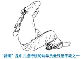 第二天拉出去继续折磨。相桃女被戴着手铐脚镣毒打,人被打倒之后,头重重的砸在地上,几乎昏死过去。因为不肯屈服于恶警的刑讯逼供,有一次被铐上了背铐(也被称为扁担铐。就是一只手从肩上向后,与另一只手从背后铐起来),戴着脚镣在看守所的院子里绕场两圈示众羞辱。由于手铐脚镣都铐得紧,绕场走了两圈铐子已经磨破了皮肤,深深的勒到肉里,血肉模糊。